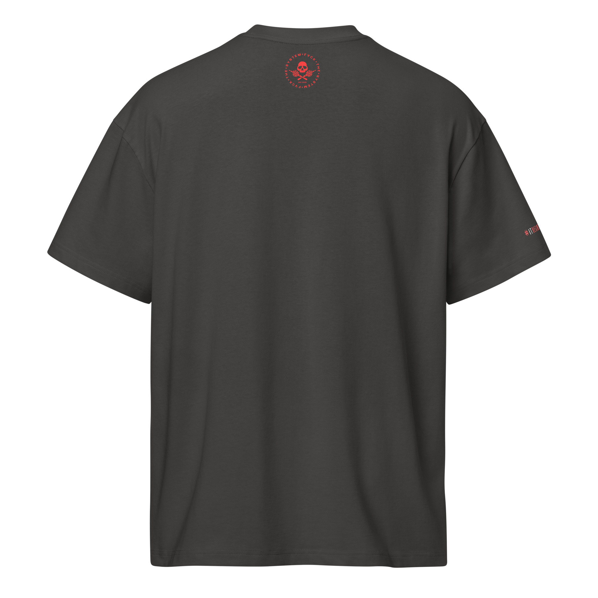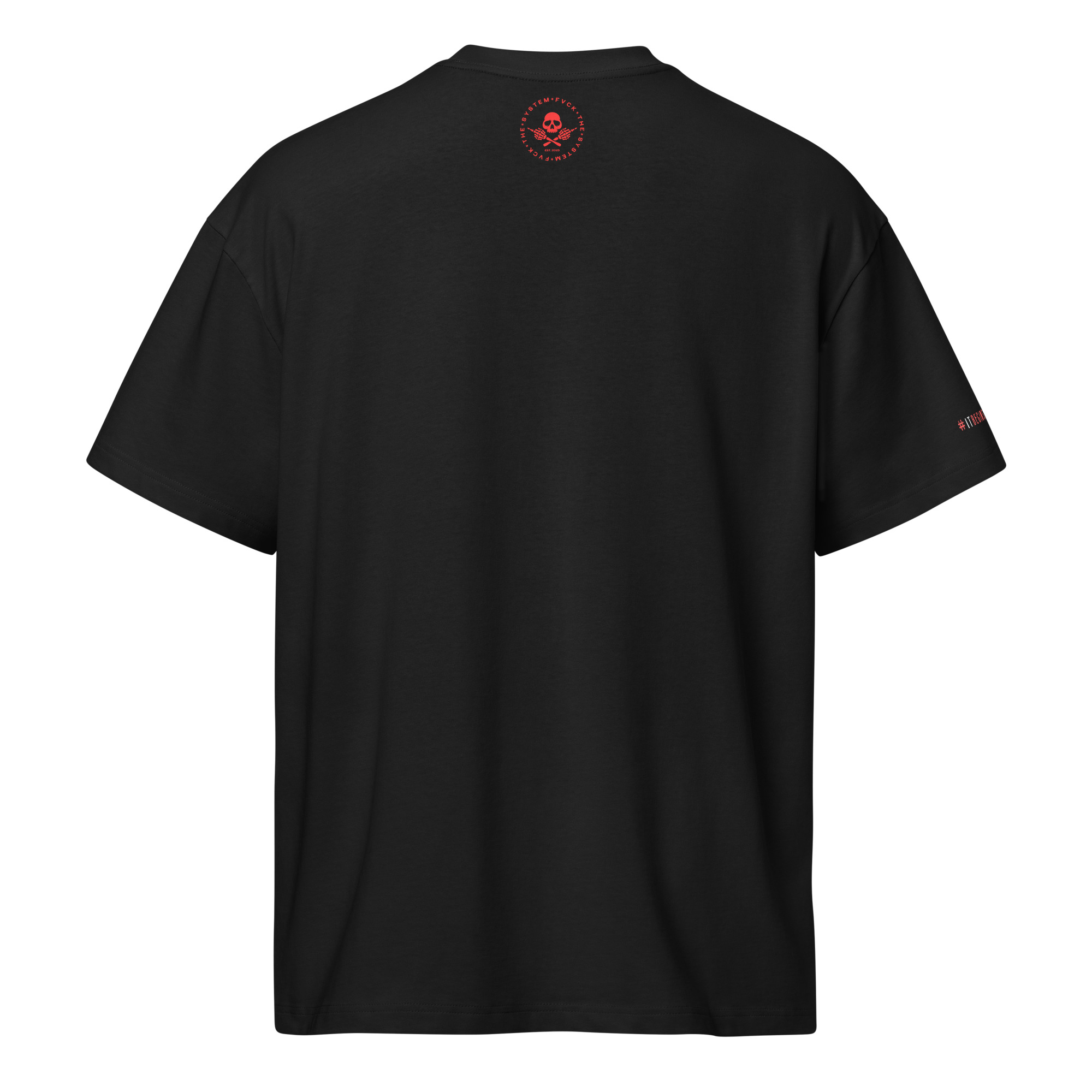 Set against a striking red backdrop, stamped with FUCK THE SYSTEM, this piece doesn’t whisper dissent. It declares it.